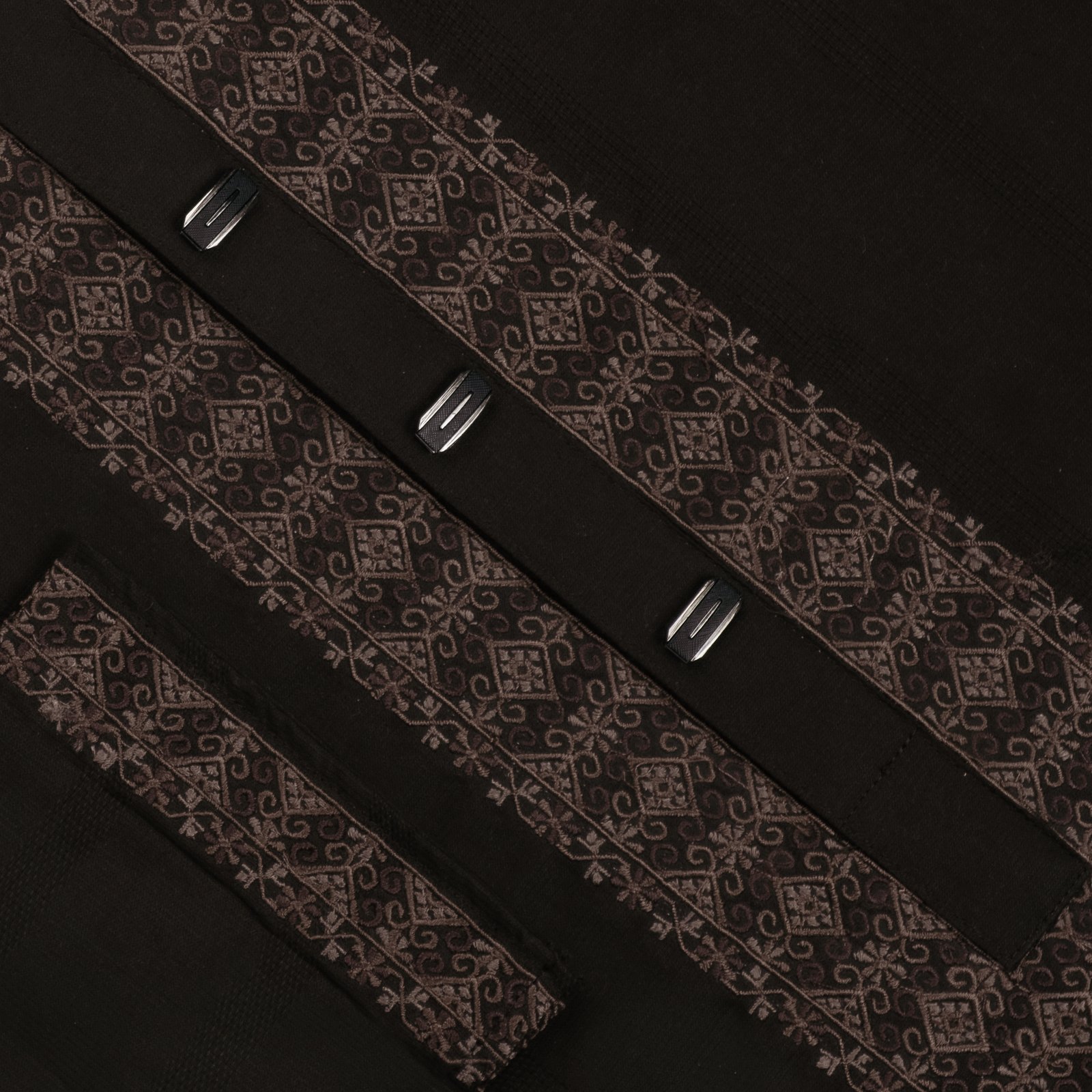 Design: Elegant embroidery decorates the collar, overlay placket, and buttoned cuffs, adding a touch of sophistication.