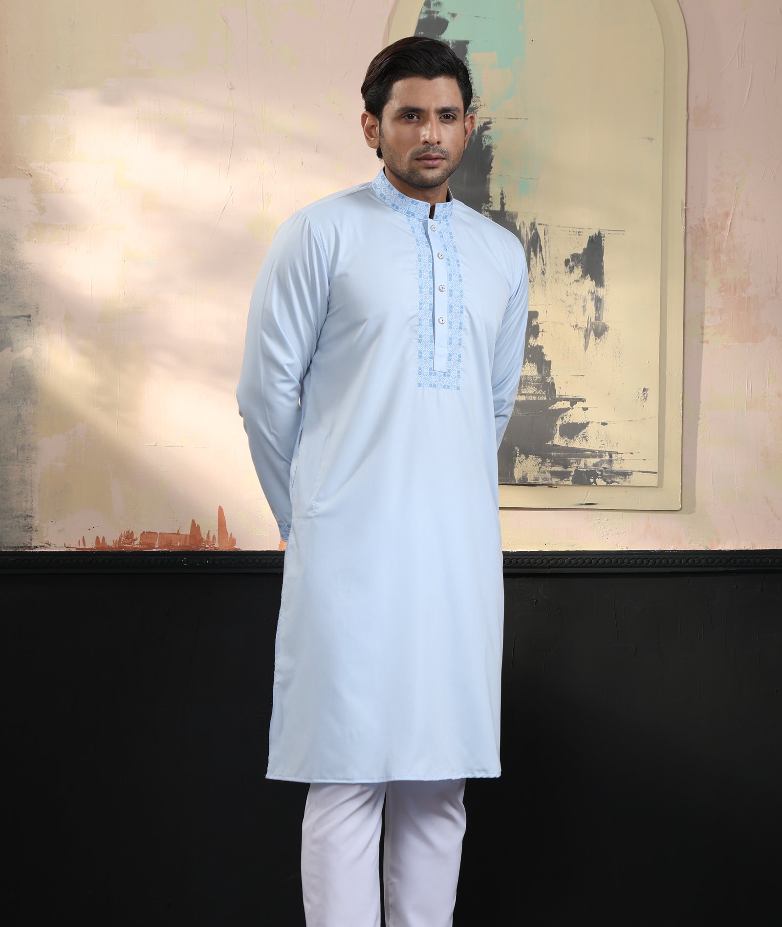 Design: Elegant embroidery decorates the collar, overlay placket, and buttoned cuffs, adding a touch of sophistication.