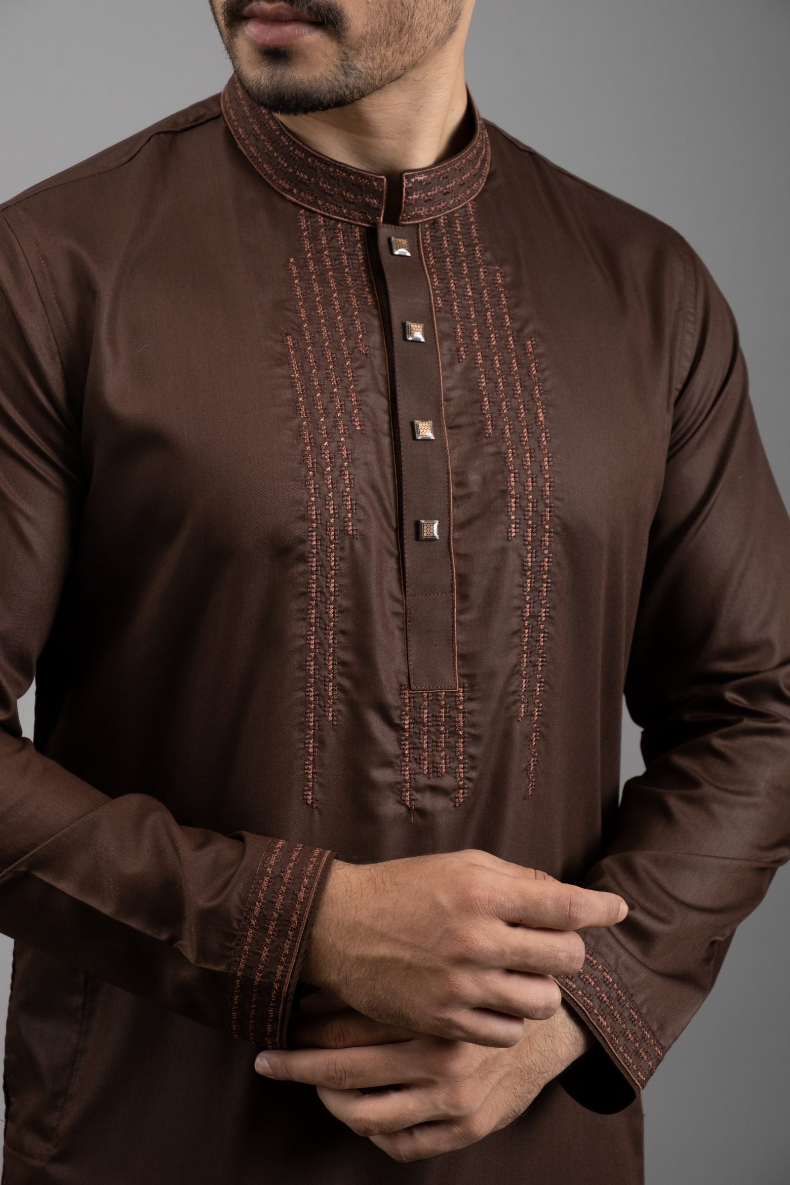 Design: Elegant embroidery decorates the collar, overlay placket, adding a touch of sophistication.
