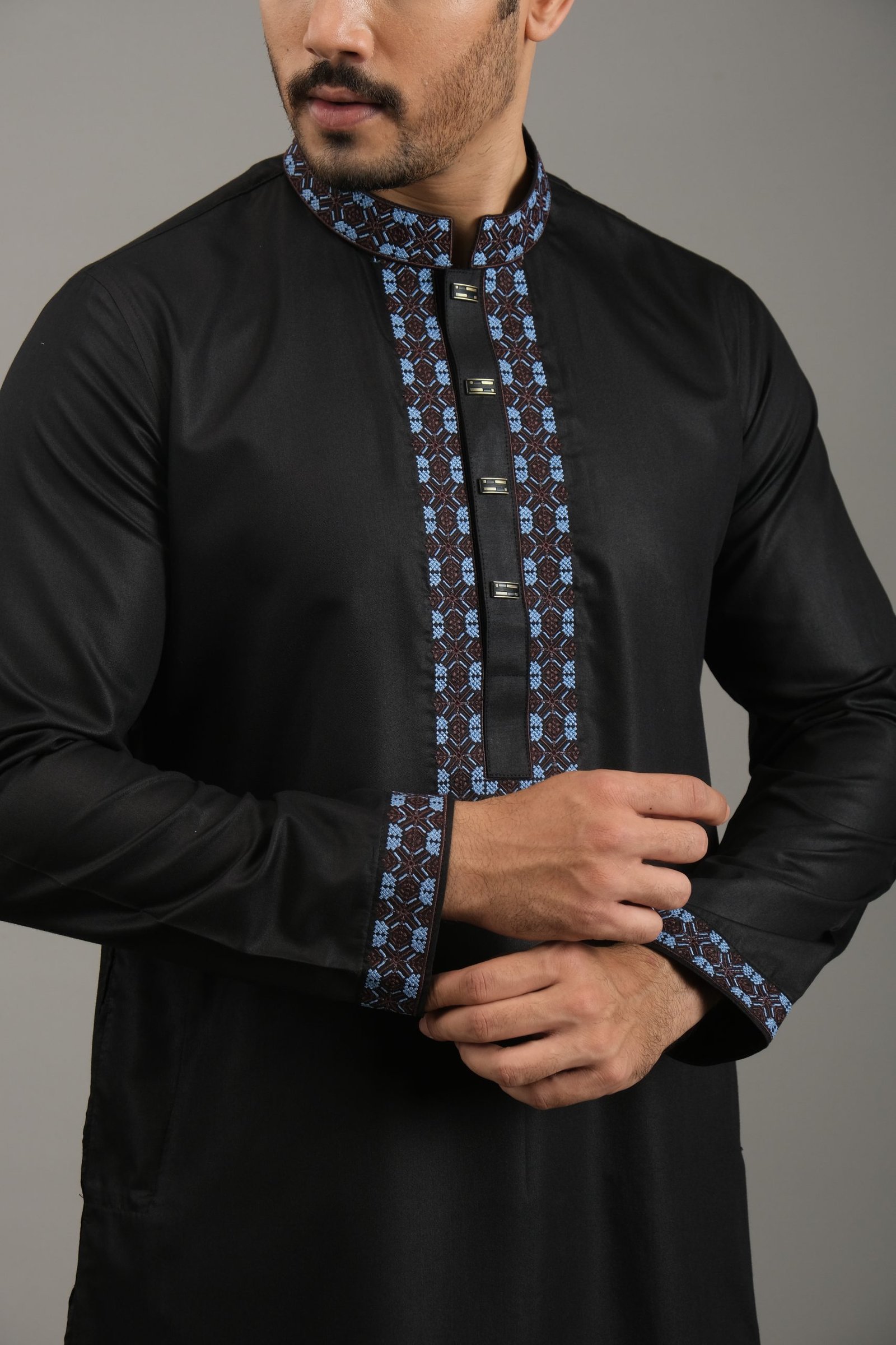 Design: Elegant embroidery decorates the collar, overlay placket, adding a touch of sophistication.